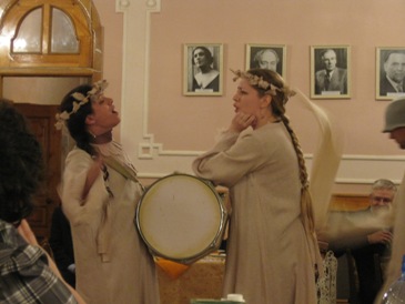 Актрисы театра участницы группы "Нужен холодильник" приветствовали виновницу торжества пением и барабанным боем.