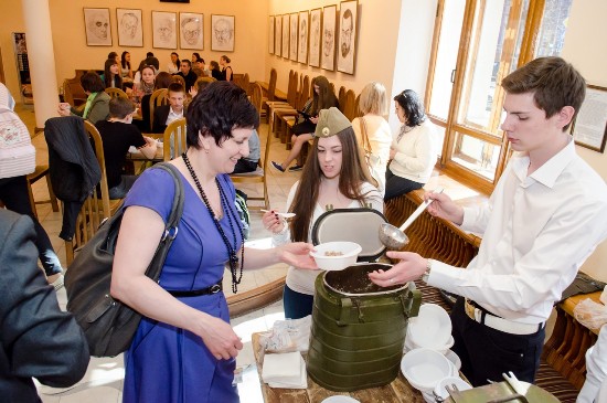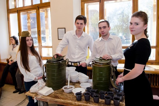8 мая, накануне Дня победы, зрителей Камерного театра, пришедших на спектакль «Марьино поле», встретила полевая кухня с компотом, пахучей и вкусной (сами зрители это подтверждали) гречневой кашей. Кашей угощали волонтеры, будущие актеры – студенты первого курса театрального отделения ЧГАКИ. Они же организовали импровизированный привал, где, удобно устроившись, с упоением исполняли песни военных лет.