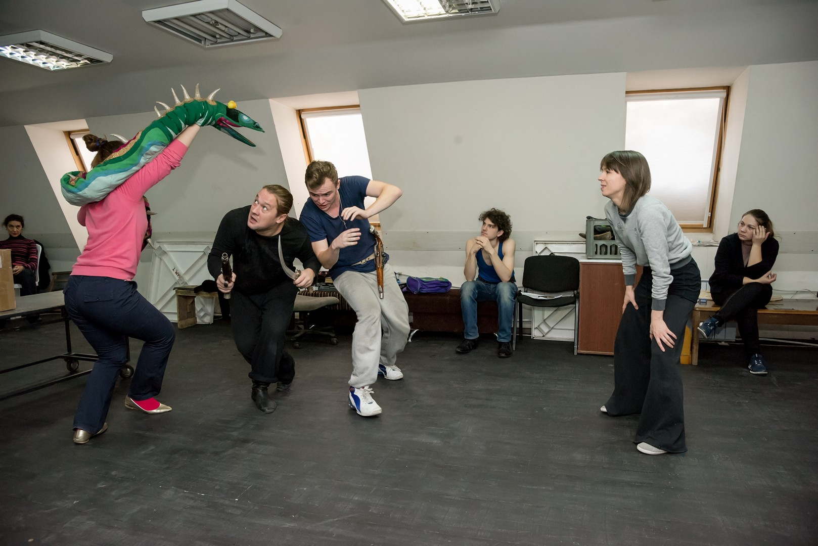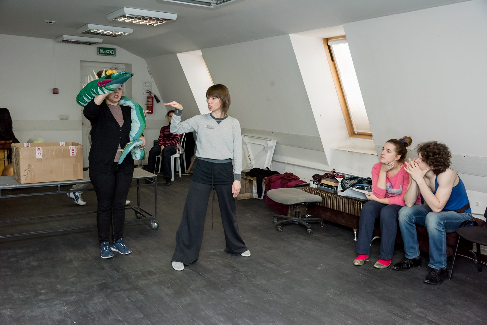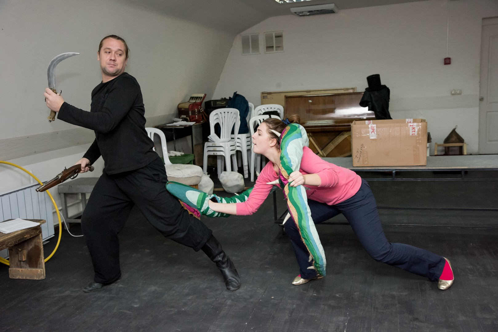 Кроме пиратов и призраков действующими лицами спектакля станут цирковые артисты. А участниками – не только актеры театра, но и выпускники театрального отделения ЧГАКИ курса Виктории Мещаниновой. «Нам повезло: одна из студенток , занятых в спектакле, действительно занималась в цирковой студии. Вот и родилась мысль – почему бы ни включить в спектакль цирковые номера. Так что теперь участники репетиций еще и учатся жонглировать», - рассказал постановщик Олег Хапов. Цирковые навыки необходимо приобрести всего за месяц, что вряд ли возможно без консультации настоящих артистов цирка. Такими консультантами для театра стали художественный руководитель артгруппы Арена74 Сергей Парватов и артистка цирка Елена Бахарева. А основная нагрузка по работе с участниками спектакля легла на хореографа Юлию Репицину.