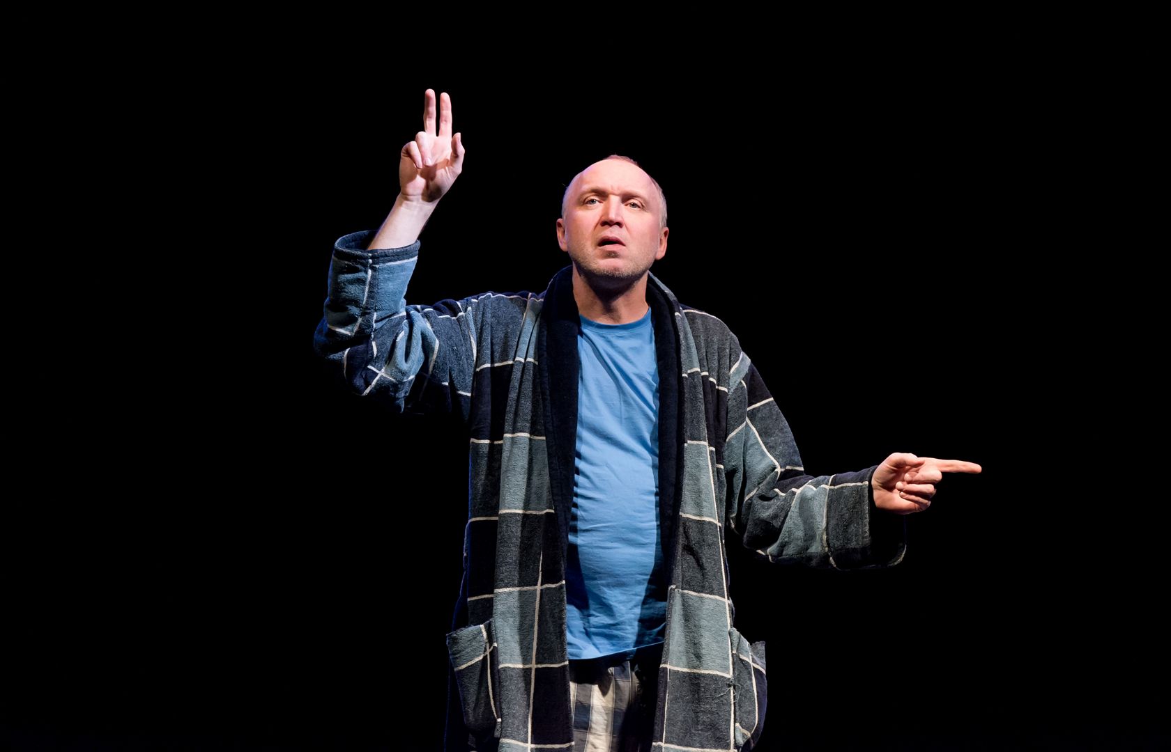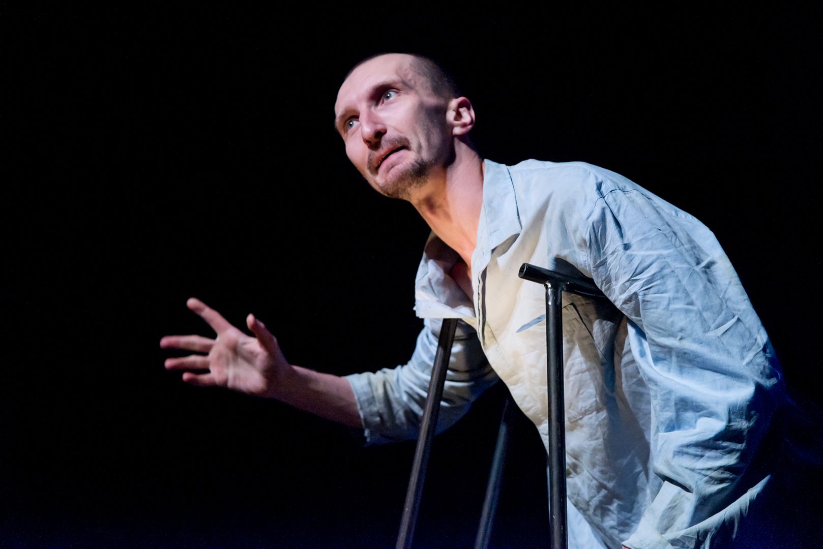 Так сложилось, что в афишу четвёртого дня попали сразу две «исповеди сумасшедшего» в формате моноспектаклей. В обеих постановках диалог со зрителем ведётся от лица героя, не вполне здорового психически. Первый – главный герой «Разговора в разговоре» – пациент ленинградской психиатрической больницы, в мастерском исполнении Олега Алмазова, широкому кругу зрителей больше известного в качестве звезды телесериалов.(К слову, «Разговор» – это пока единственный опыт осмысления поэмы Бродского «Горбунов и Горчаков» в форме моноспектакля).