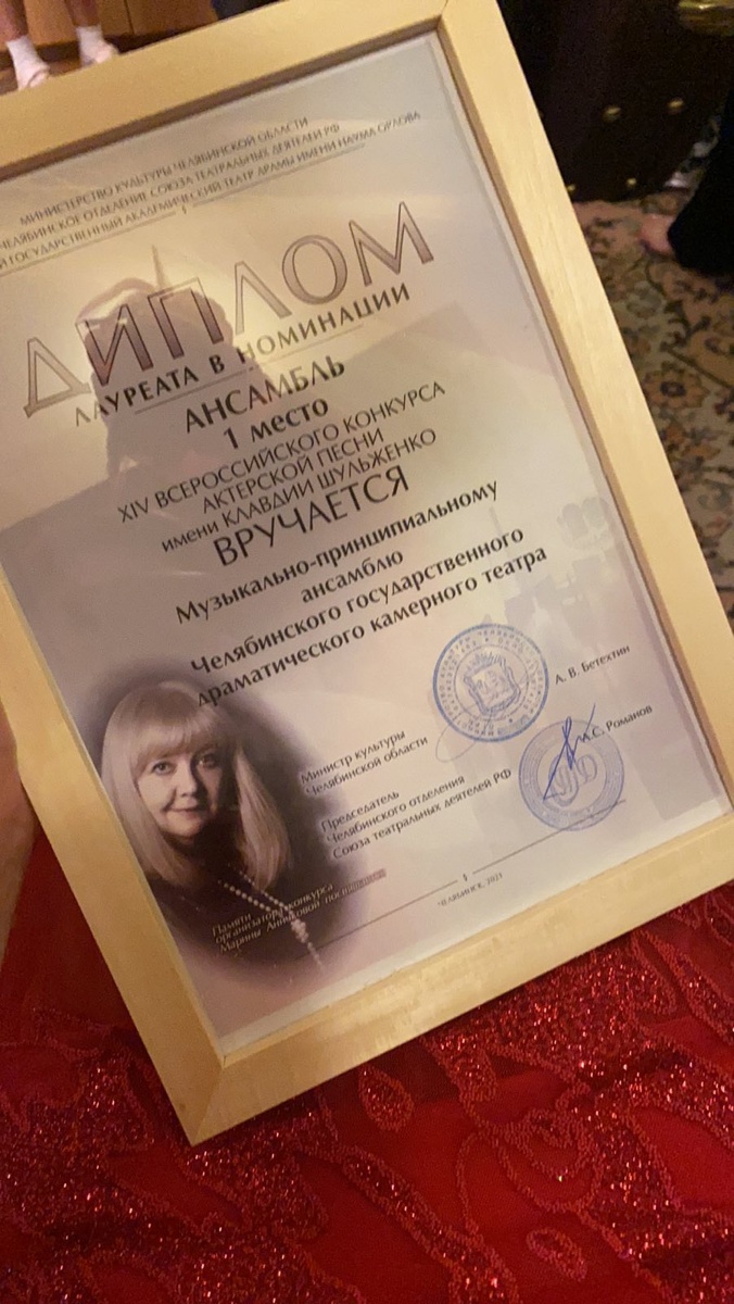 Только что в театре драмы имени Наума Орлова закончился гала-концерт лауреатов XIV всероссийского конкурса актёрской песни имени Клавдии Шульженко. Музыкально-принципиальный ансамбль Камерного театра ( муз. руководитель : Спирёва В.Ю. , участники : П. Артемьева , Н. Савиных , А. Ребро , А. Сметанина , Д. Блинкова , М. Вознесенской , Е. Евлаш , В. Спирёвой) с песней Анастасии Минцковской «Актёрская судьба» занял 1 место в номинации «Ансамбль» .