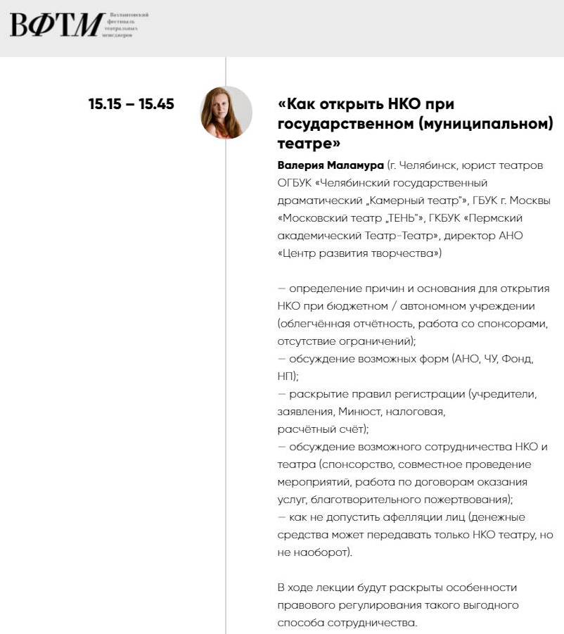 Юрист Камерного театра Валерия Маламура - спикер ВФТМ