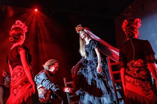 Генеральный прогон первой премьеры нового сезона в Камерном театре начался с перформанса в фойе. Поскольку на сцене актерам предстояло сыграть «Кровавую свадьбу» по пьесе
