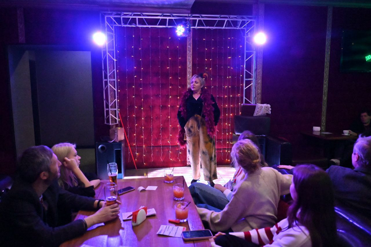 Представление прошло на необычной сцене, точнее в зале караоке-бара «Baccara». Неординарным был и перфоманс с элементами фокусов и интерактива со зрителями. Поставил его режиссёр Радион Букаев, художником была Надежда Иванова, а главную (и единственную) роль блистательно исполнила заслуженная артистка республики Татарстан Елена Калаганова. Ну а одним из гостей была её коллега – актриса челябинского Камерного театра и телеведущая Марина Гез.