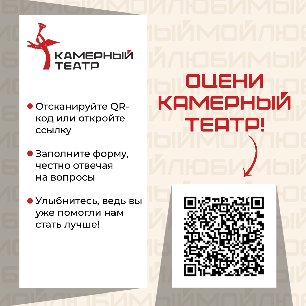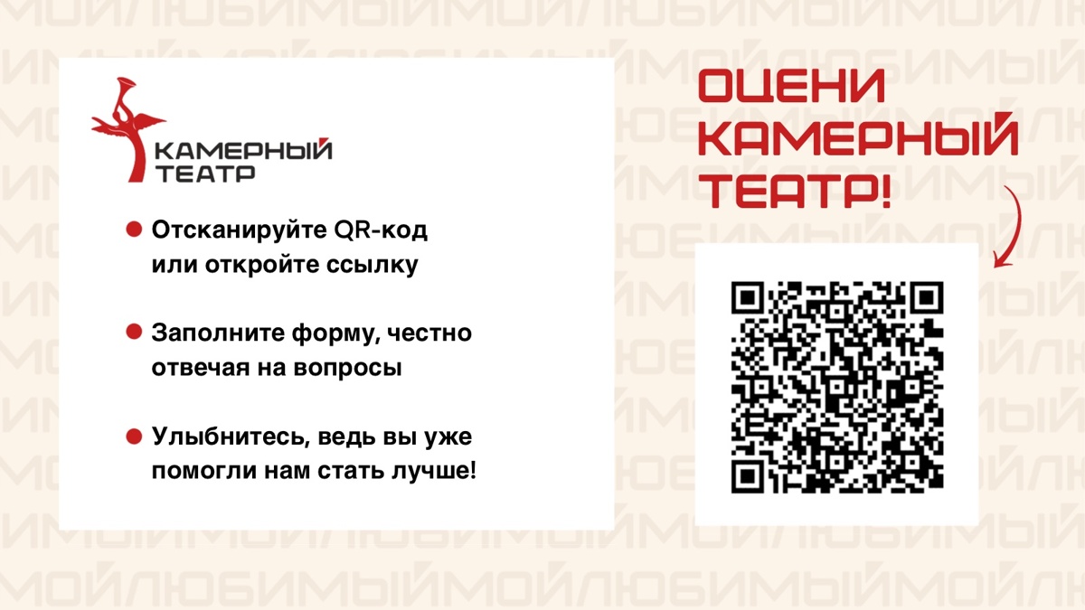 Вы знаете, как мы стараемся, чтобы вы получали только приятные эмоции от посещения Камерного театра. О качестве услуг в учреждениях заботится и Министерство культуры РФ. Разработан опрос, который поможет выявить лучшие стороны и проблемы, если они есть, конечно.