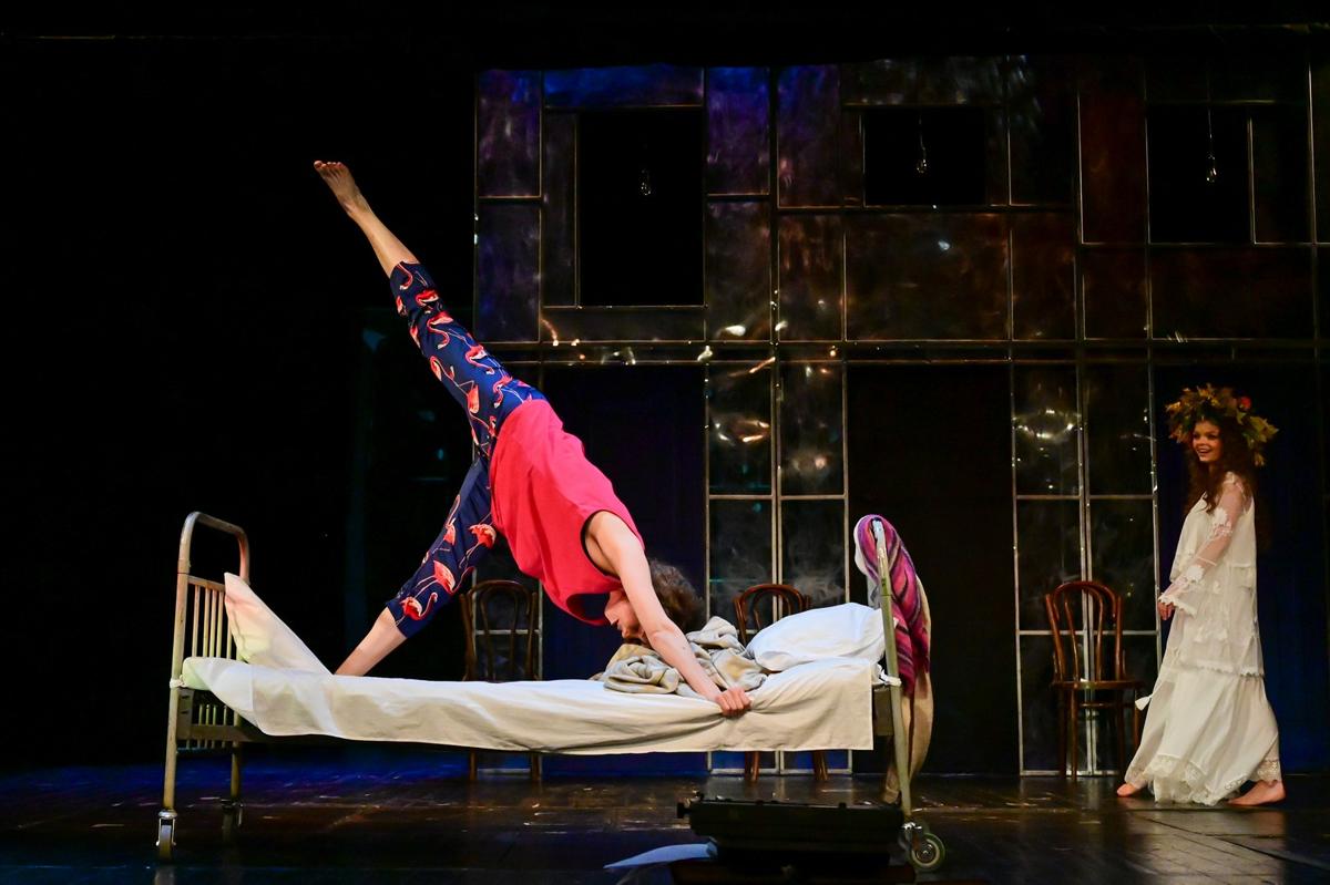 Вот оно — зеркало в раме с туалетным столиком, на котором пудра и духи «Красная Москва». Вот она — печатная машинка на стопке книг. Зеленый телефон с трубкой на пружинном шнуре. Телевизор, который показывает немую сетку, как во времена, когда каналам не хватало контента. Платяной шкаф, в котором хранится просто все. Советский быт реконструирован с нежностью и знанием (художник-постановщик Ольга Герр, Санкт-Петербург) . Странно, правда, что роль дивана играет кровать на колесиках, как в больнице...