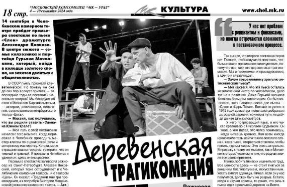 14 сентября я Челябинском камерном театре пройдет премьера спектакля по пьесе «Слои» драматурга Александра Копкова. В центре сюжета — семья колхозника и партийца Гурьяна Мочалкина, который, найдя в колодце золотого на, но захотел делиться общественностью.